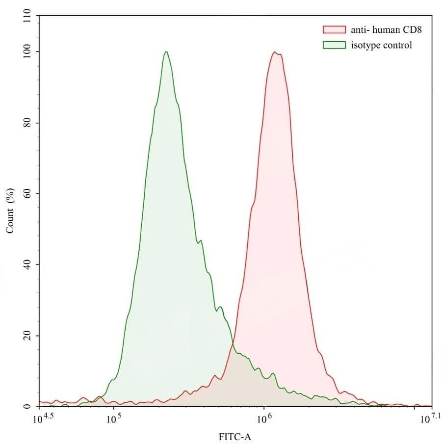 Flow-cytometry using anti- human CD8 antibody.Human RPMI-8226 cell line were stained with an irrelevant antibody (Gray Histogram) or an anti- human CD8 antibody monoclonal antibody (Catalog No.:TD-HF815107 , Red Histogram) at a concentration of 20ug/ml for 30 mins at RT. After washing, bound antibody was detected using a CoraLite488 conjugated goat anti-mouse antibody (Catalog No.:TD-MF690314) and cells analysed on a NovoCyte Flow Cytometer. | SEC-HPLC detection for Anti-Human CD8A Antibody (mab1).