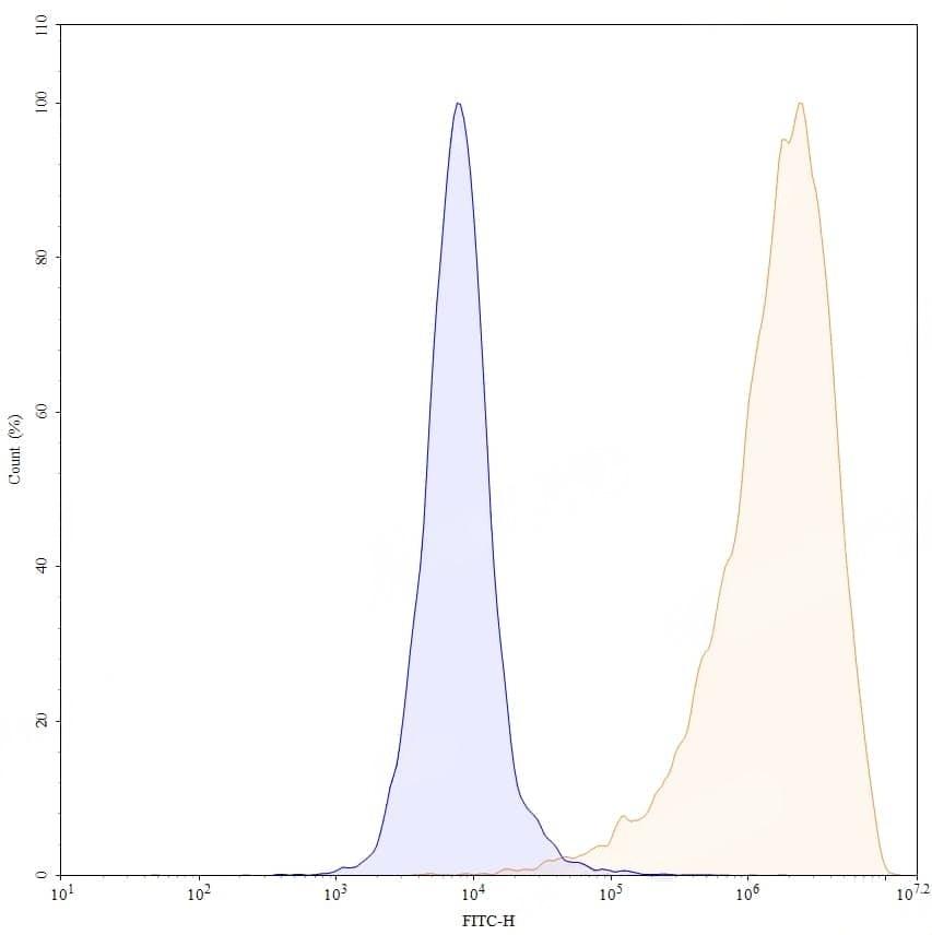Flow-cytometry using anti-human MSLN antibody.HeLa cells were stained with an irrelevant antibody (Blue Histogram) or an anti-human MSLN antibody monoclonal antibody (Catalog No.:TD-HC496107 ,Green Histogram) at a concentration of 5 µg/ml for 30 mins at RT. After washing, bound antibody was detected using a FITC conjugated goat anti-mouse antibody (Catalog No.:TD-MF690414) and cells analysed on a NovoCyte Flow Cytometer. | Flow-cytometry using anti-human MSLN antibody. Untransfected cells (blue Histogram) and Transfected cells (Yellow Histogram) were stained with an anti-human MSLN monoclonal antibody (Catalog No.:TD-HC496107) at a concentration of 5 µg/ml for 30 mins at RT. After washing, bound antibody was detected using a Goat Anti-Mouse IgG H&L Polyclonal Antibody, FITC (Catalog No.:TD-MF690414) and cells analysed on a NovoCyte Flow Cytometer.