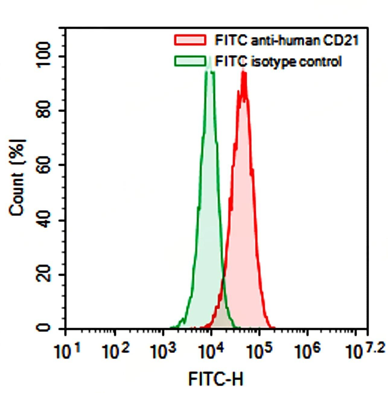 Flow-cytometry using FITC anti-Human CD21 antibody. Raji cells were stained with an irrelevant antibody (Green Histogram) or a FITC anti-Human CD21 antibody monoclonal antibody (Catalog No.:TD-HB939317 , Red Histogram) at a concentration of 5 µg/ml for 30 mins at RT. After washing, cells analysed on a NovoCyte Flow Cytometer.