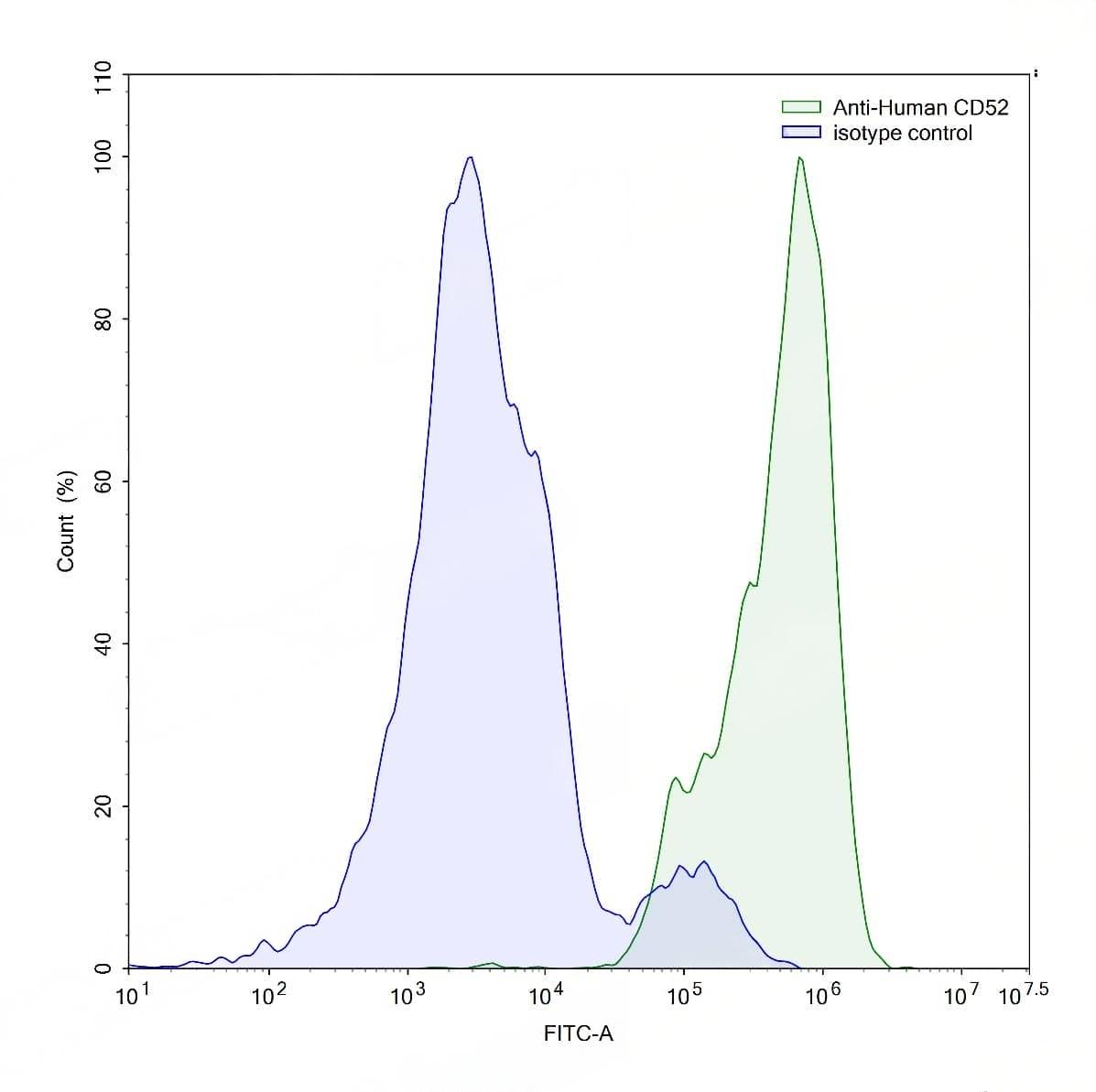 Flow-cytometry using anti-human CD52 antibody.Human peripheral blood lymphocytes were stained with an irrelevant antibody (Blue Histogram) or an anti-human CD52 antibody monoclonal antibody (Catalog No.:TD-HB894207 ,Green Histogram) at a concentration of 5 µg/ml for 30 mins at RT. After washing, bound antibody was detected using a FITC conjugated goat anti-mouse antibody (Catalog No.:TD-MF690414) and cells analysed on a NovoCyte Flow Cytometer. | Flow-cytometry using anti-human CD52 antibody. Untransfected cells (blue Histogram) and Transfected cells (Yellow Histogram) were stained with an anti-human CD52 monoclonal antibody (Catalog No.:TD-HB894207) at a concentration of 5 µg/ml for 30 mins at RT. After washing, bound antibody was detected using a Goat Anti-Mouse IgG H&L Polyclonal Antibody, FITC (Catalog No.:TD-MF690414) and cells analysed on a NovoCyte Flow Cytometer. | Western blot analysis was performed using anti-CD52 monoclonal antibody at 1ug/mL on various samples.Lane 1:recombinant human CD52 (Catalog No.:TD-HB894011)Lane 2:negative control