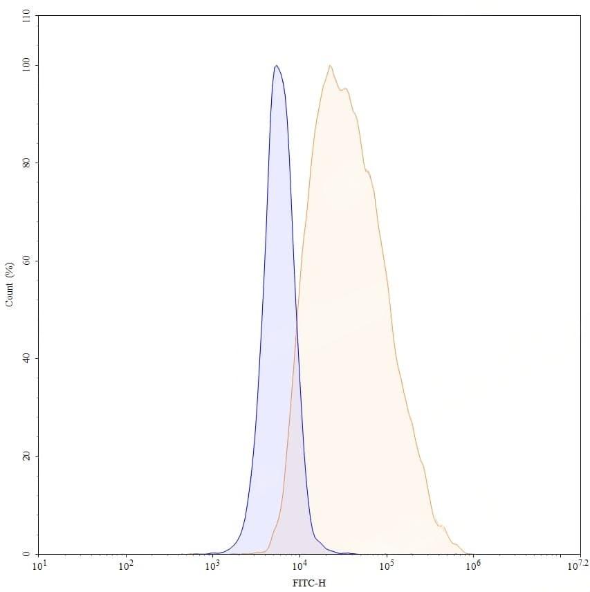 Flow-cytometry FITC using anti-human CD52 antibody. Untransfected cells (blue Histogram) and Transfected cells (Yellow Histogram) were stained with an FITC anti-human CD52 monoclonal antibody (Catalog No.:TD-HB894117) at a concentration of 5 µg/ml for 30 mins at RT. After washing, cells analysed on a NovoCyte Flow Cytometer.
