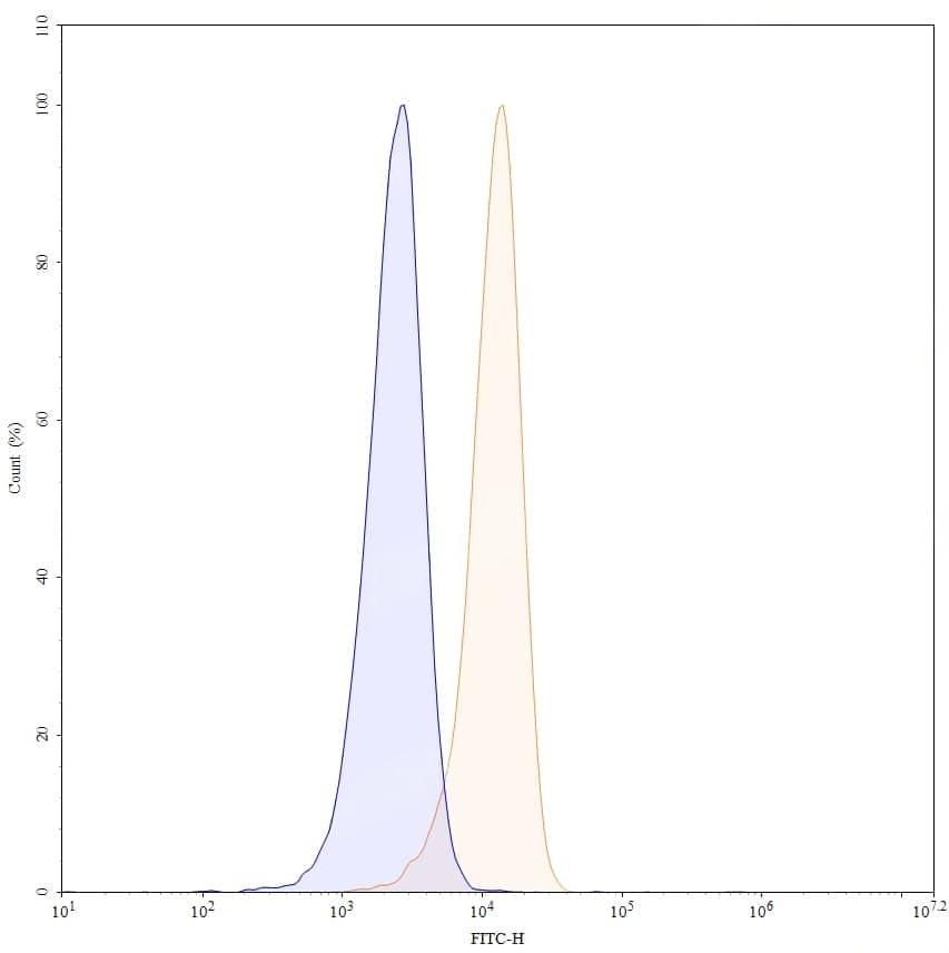 Flow-cytometry using FITC anti-human CD11a antibody. Jurkat cells were stained with an irrelevant antibody (Blue Histogram) or an FITC anti-human CD11a monoclonal antibody (Catalog No.:TD-HB805117, Yellow Histogram) at a concentration of 5 µg/ml for 30 mins at RT. After washing, and cells analysed on a NovoCyte Flow Cytometer.