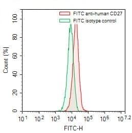 Flow-cytometry using FITC anti-human CD27 antibody. Raji cells were stained with an irrelevant antibody (Green Histogram) or a FITC anti-human CD27 antibody monoclonal antibody (Catalog No.:TD-HB796117, Red Histogram) at a concentration of 5 µg/ml for 30 mins at RT. After washing, cells analysed on a NovoCyte Flow Cytometer.