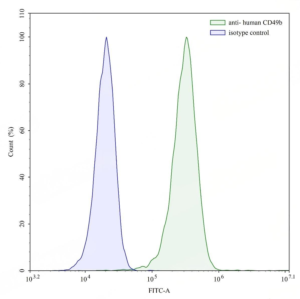 Flow-cytometry using anti-human CD49b antibody.293T cells were stained with an irrelevant antibody (Blue Histogram) or an anti-human CD49b antibody monoclonal antibody (Catalog No.:TD-HB772107 ,Green Histogram) at a concentration of 5 µg/ml for 30 mins at RT. After washing, bound antibody was detected using a FITC conjugated goat anti-mouse antibody (Catalog No.:TD-MF690414) and cells analysed on a NovoCyte Flow Cytometer. | Flow-cytometry using anti-human CD49b antibody.HaCaT cells were stained with an irrelevant antibody (Blue Histogram) or an anti-human CD49b antibody monoclonal antibody (Catalog No.:TD-HB772107 ,Green Histogram) at a concentration of 5 µg/ml for 30 mins at RT. After washing, bound antibody was detected using a FITC conjugated goat anti-mouse antibody (Catalog No.:TD-MF690414) and cells analysed on a NovoCyte Flow Cytometer. | Flow-cytometry using anti-human CD49b antibody.HUVEC cells were stained with an irrelevant antibody (Blue Histogram) or an anti-human CD49b antibody monoclonal antibody (Catalog No.:TD-HB772107 ,Green Histogram) at a concentration of 5 µg/ml for 30 mins at RT. After washing, bound antibody was detected using a FITC conjugated goat anti-mouse antibody (Catalog No.:TD-MF690414) and cells analysed on a NovoCyte Flow Cytometer. | Flow-cytometry using anti-human CD49b antibody.A431 cells were stained with an irrelevant antibody (Blue Histogram) or an anti-human CD49b antibody monoclonal antibody (Catalog No.:TD-HB772107 ,Green Histogram) at a concentration of 5 µg/ml for 30 mins at RT. After washing, bound antibody was detected using a FITC conjugated goat anti-mouse antibody (Catalog No.:TD-MF690414) and cells analysed on a NovoCyte Flow Cytometer.