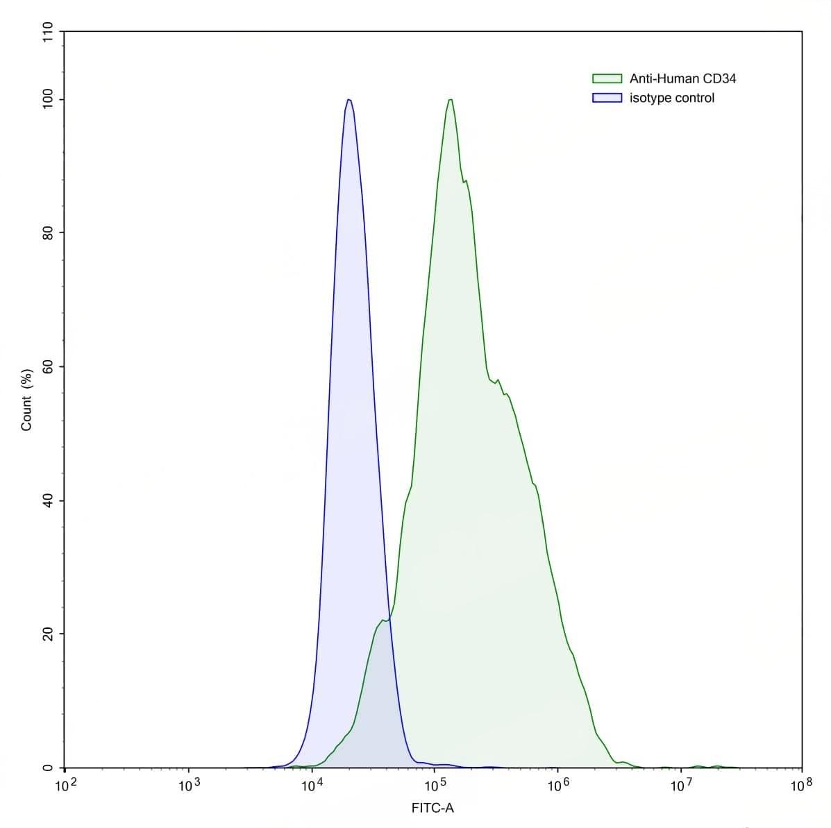 SEC-HPLC detection for Anti-Human CD34 Antibody (QBEND-10). | Flow-cytometry using anti-human CD34 antibody.CD34 Transfected CHO cells were stained with an irrelevant antibody (Blue Histogram) or an anti-human CD34 antibody monoclonal antibody (Catalog No.:TD-HB766207 ,Green Histogram) at a concentration of 5 µg/ml for 30 mins at RT. After washing, bound antibody was detected using a FITC conjugated goat anti-mouse antibody (Catalog No.:TD-MF690414) and cells analysed on a NovoCyte Flow Cytometer. | Flow-cytometry using anti-human CD34 antibody.KG-1 cells were stained with an irrelevant antibody (Blue Histogram) or an anti-human CD34 antibody monoclonal antibody (Catalog No.:TD-HB766207 ,Green Histogram) at a concentration of 5 µg/ml for 30 mins at RT. After washing, bound antibody was detected using a FITC conjugated goat anti-mouse antibody (Catalog No.:TD-MF690414) and cells analysed on a NovoCyte Flow Cytometer.