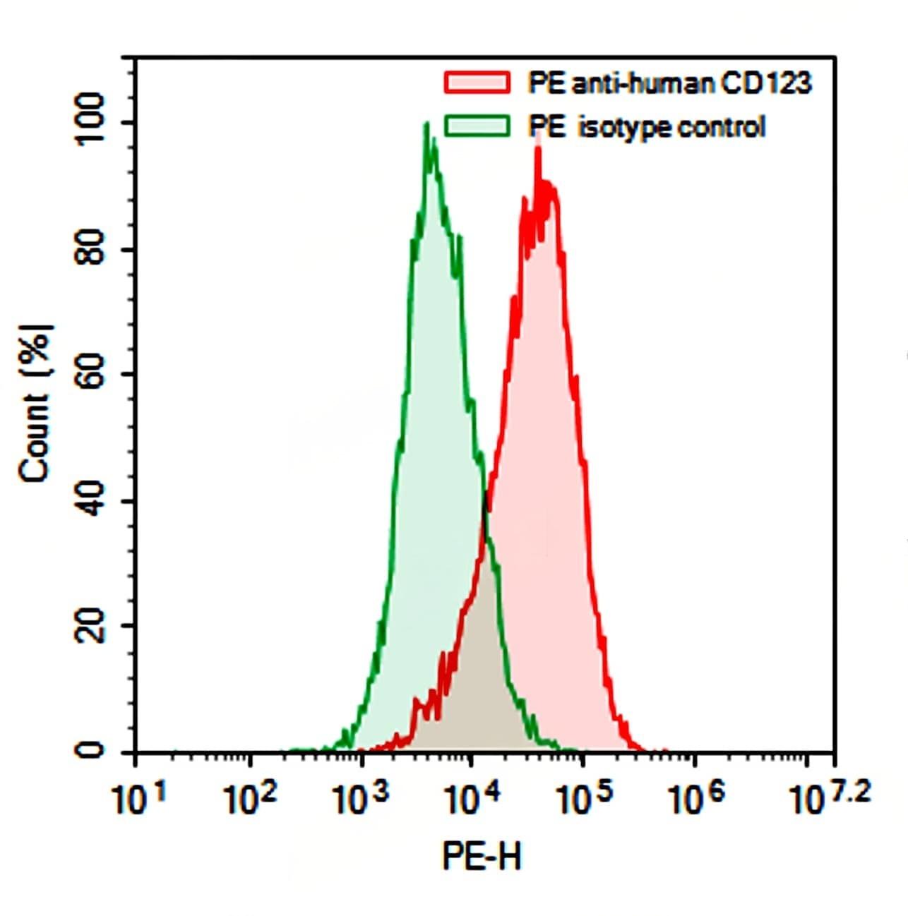Flow-cytometry using PE anti-Human CD123 antibody. KG-1 cells were stained with an irrelevant antibody (Green Histogram) or a PE anti-Human CD123 antibody monoclonal antibody (Catalog No.:TD-HB714127 , Red Histogram) at a concentration of 5 µg/ml for 30 mins at RT. After washing, cells analysed on a NovoCyte Flow Cytometer.