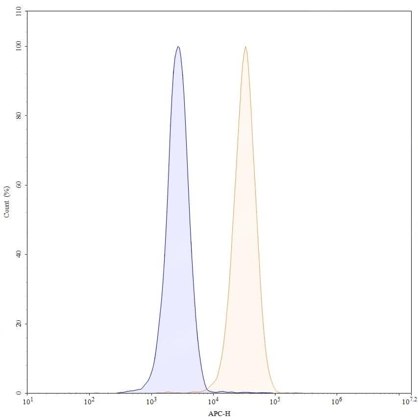 Flow-cytometry using APC anti-human CD13 antibody. U937 cells were stained with an irrelevant antibody (Blue Histogram) or an APC anti-human CD13 monoclonal antibody (Catalog No.:TD-HB650137, Yellow Histogram) at a concentration of 5 µg/ml for 30 mins at RT. After washing, and cells analysed on a NovoCyte Flow Cytometer.