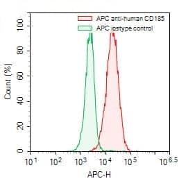 Flow-cytometry using APC anti-human CD185(CXCR5) antibody. Raji cells were stained with an irrelevant antibody (Green Histogram) or an APC anti-human CD185(CXCR5) antibody monoclonal antibody (Catalog No.:TD-HB160137, Red Histogram) at a concentration of 5 µg/ml for 30 mins at RT. After washing, cells analysed on a NovoCyte Flow Cytometer. | Flow-cytometry using APC anti-human CD185 antibody. Raji cells were stained with an irrelevant antibody (Blue Histogram) or an APC anti-human CD185 monoclonal antibody (Catalog No.:TD-HB160137, Yellow Histogram) at a concentration of 5 µg/ml for 30 mins at RT. After washing, cells analysed on a NovoCyte Flow Cytometer.