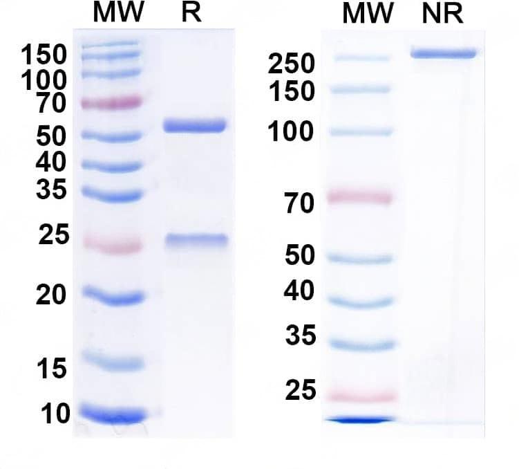 SEC-HPLC detection for Anti-HBV-D HBcAg/HBeAg Antibody (E13#). | SDS-PAGE for Anti-HBV-D HBcAg/HBeAg Antibody (E13#).