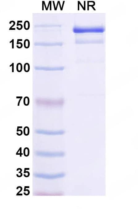 SDS-PAGE for Anti-HCV NS1/gp68/gp70/Envelope glycoprotein E2 Antibody (AP33). | Western blot analysis was performed using anti-HCV E2 monoclonal antibody at 1ug/mL on various samples.Lane 1:recombinant HCV NS1/gp68/gp70/Envelope glycoprotein E2 (Catalog No.:TD-VK681011)Lane 2:negative control
