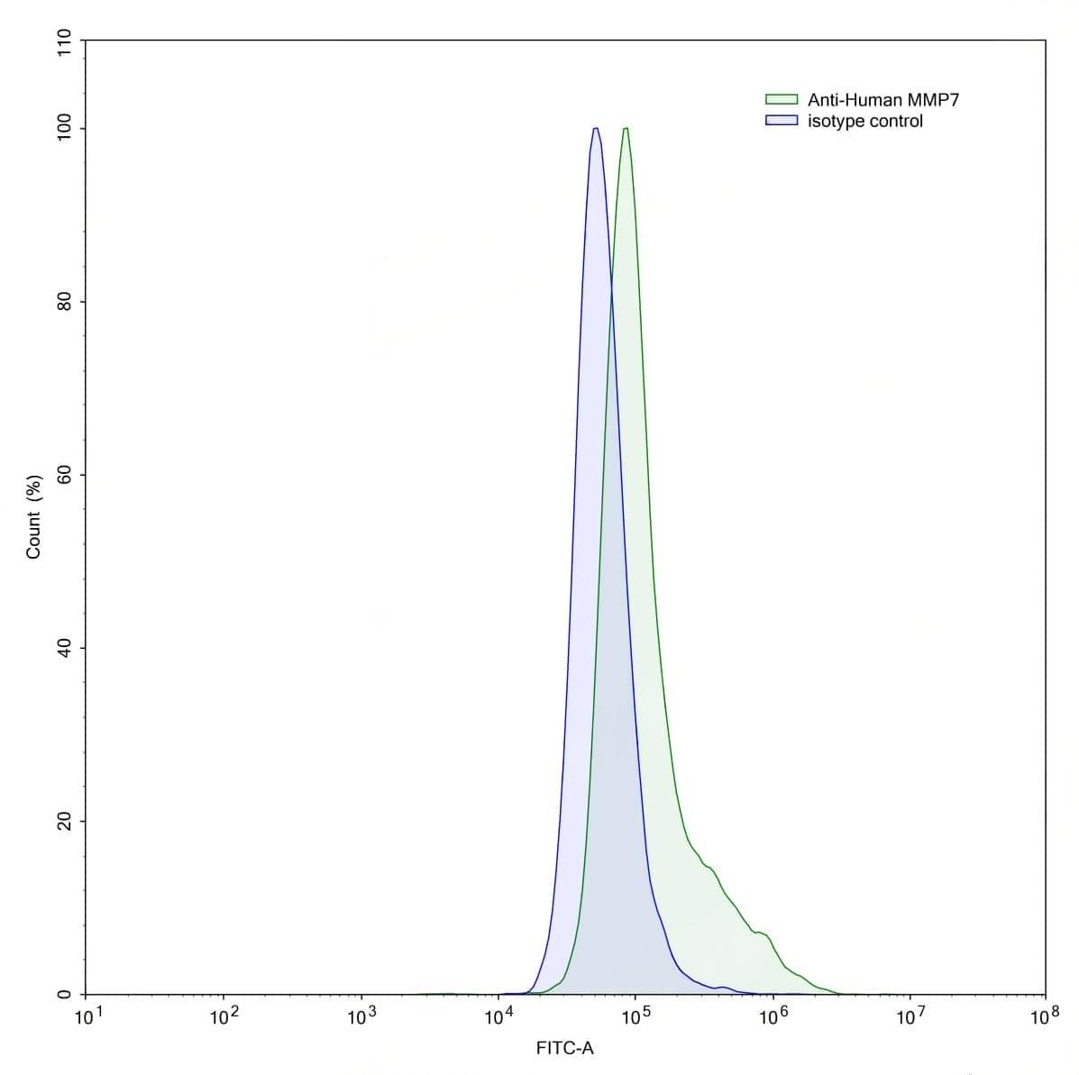Flow-cytometry using anti-human MMP7 antibody.A549 cells were stained with an irrelevant antibody (Blue Histogram) or an anti-human MMP7 antibody monoclonal antibody (Catalog No.:TD-HY393023 ,Green Histogram) at a concentration of 5 µg/ml for 30 mins at RT. After washing, bound antibody was detected using a FITC conjugated goat anti-mouse antibody (Catalog No.:TD-MF690414) and cells analysed on a NovoCyte Flow Cytometer. | SDS-PAGE for Anti-Human MMP7 Antibody (SAA2034). | Western blot analysis was performed using anti-MMP7 monoclonal antibody at 1μg/ml on various samples.Lane 1:recombinant human MMP7 (Catalog No.:TD-HY393012), 50ngLane 2:recombinant human MMP7 (Catalog No.:TD-HY393012), 30ngLane 3:recombinant human MMP7 (Catalog No.:TD-HY393012), 20ngLane 4:recombinant human MMP7 (Catalog No.:TD-HY393012), 10ng