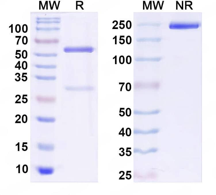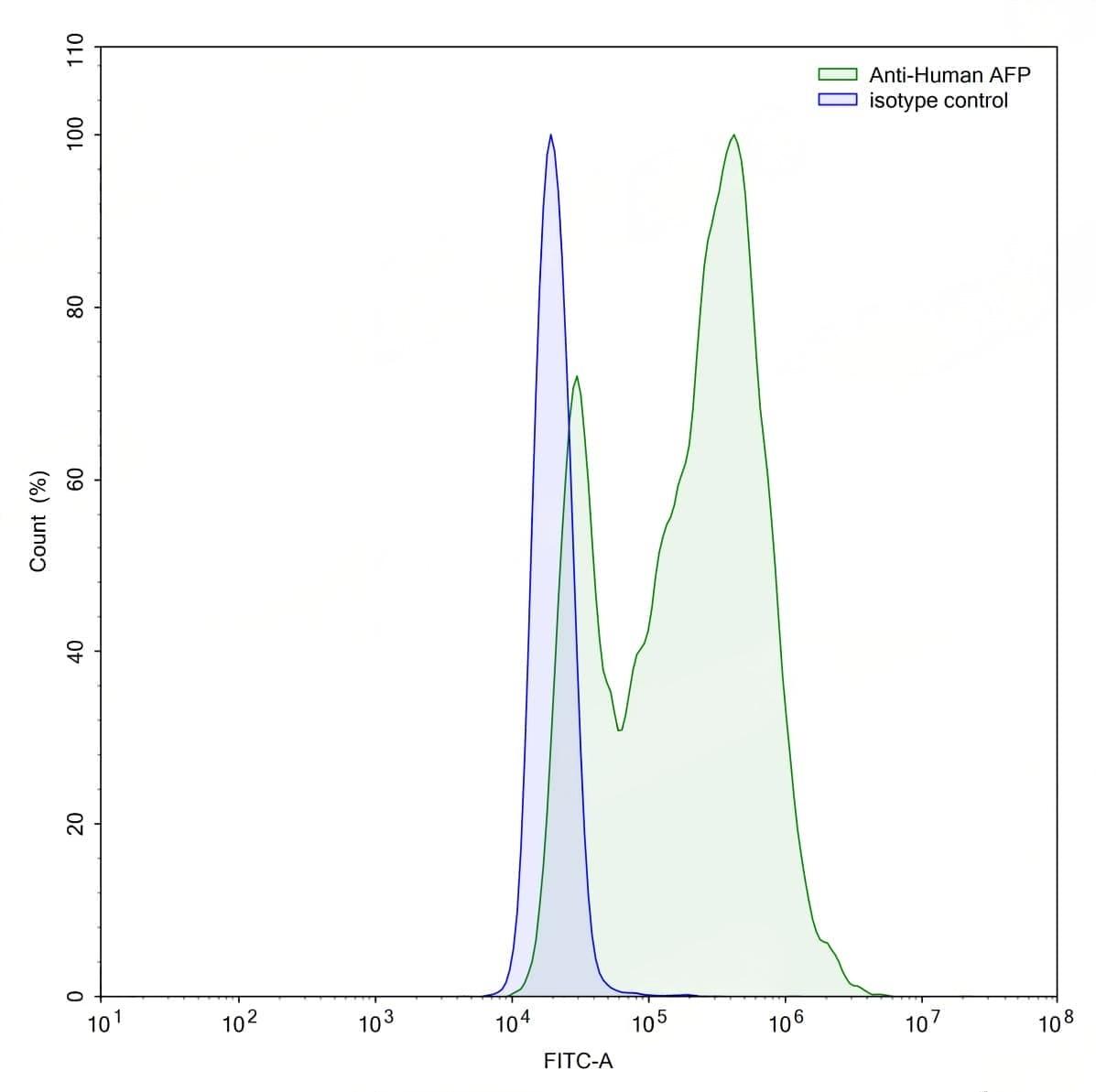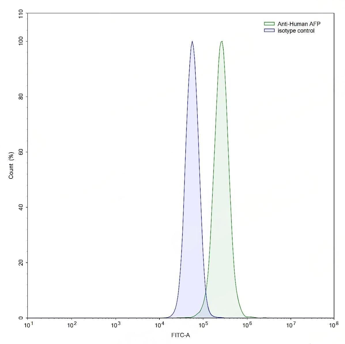 Flow-cytometry using anti-human AFP antibody.AFP Transfected CHO cells were stained with an irrelevant antibody (Blue Histogram) or an anti-human AFP antibody monoclonal antibody (Catalog No.:TD-HY276010 ,Green Histogram) at a concentration of 5 µg/ml for 30 mins at RT. After washing, bound antibody was detected using a FITC conjugated goat anti-human antibody (Catalog No.:TD-HF690414) and cells analysed on a NovoCyte Flow Cytometer.,Flow-cytometry using anti-human AFP antibody.HepG2 cells were stained with an irrelevant antibody (Blue Histogram) or an anti-human AFP antibody monoclonal antibody (Catalog No.:TD-HY276010 ,Green Histogram) at a concentration of 5 µg/ml for 30 mins at RT. After washing, bound antibody was detected using a FITC conjugated goat anti-human antibody (Catalog No.:TD-HF690414) and cells analysed on a NovoCyte Flow Cytometer. | SDS-PAGE for InVivoMAb Anti-Human AFP/Alpha-fetoprotein Antibody (Iv0166).