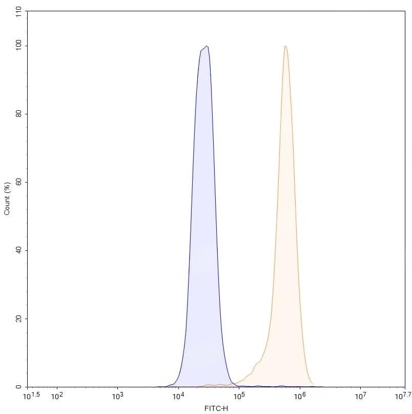 SDS-PAGE for Anti-Human FN1/Fibronectin Antibody (SAA0522) | Flow-cytometry using anti-human FN1 antibody. HepG2 cells were stained with an irrelevant antibody (Blue Histogram) or an anti-human FN1 monoclonal antibody (Catalog No.:TD-HY259013, Yellow Histogram) at a concentration of 5 µg/ml for 30 mins at RT. After washing, bound antibody was detected using a Goat Anti-Mouse IgG H&L Polyclonal Antibody, FITC (Catalog No.:TD-MF690414) and cells analysed on a NovoCyte Flow Cytometer.