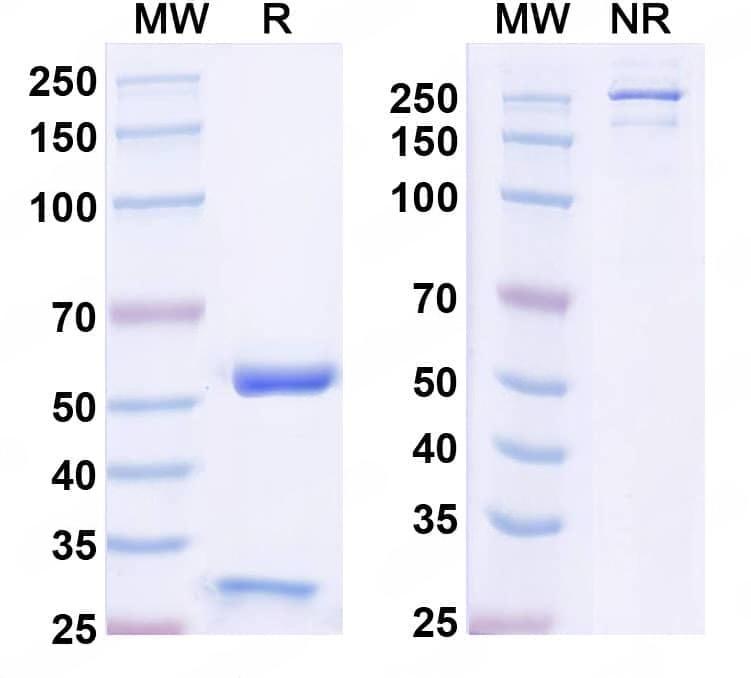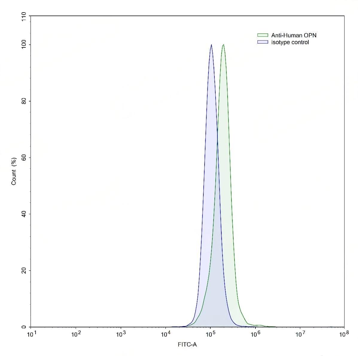 Flow-cytometry using anti-human OPN antibody.HepG2 cells were stained with an irrelevant antibody (Blue Histogram) or an anti-human OPN antibody monoclonal antibody (Catalog No.:TD-HY207010 ,Green Histogram) at a concentration of 5 µg/ml for 30 mins at RT. After washing, bound antibody was detected using a FITC conjugated goat anti-human antibody (Catalog No.:TD-HF690414) and cells analysed on a NovoCyte Flow Cytometer. | SDS-PAGE for InVivoMAb Anti-Human OPN/SPP1 (Iv0103). | Western blot analysis was performed using anti-OPN/SPP1 monoclonal antibody at 1ug/mL on various samples.Lane 1:recombinant human OPN/SPP1 (Catalog No.:TD-HY207012)Lane 2:negative control