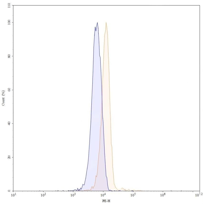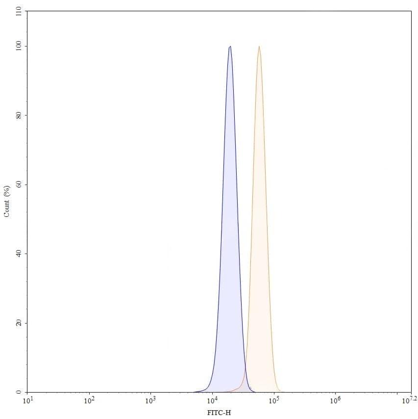 Flow-cytometry using PE anti-human BCL2 antibody. A549 cells were fixed and permeabilized, then stained with an irrelevant antibody (Blue Histogram) or an PE anti-human BCL2 monoclonal antibody (Catalog No.:TD-HY131023, Yellow Histogram) at a concentration of 5 µg/ml for 30 mins at RT. After washing, cells analysed on a NovoCyte Flow Cytometer.,Flow-cytometry using FITC anti-human BCL2 antibody. A549 cells were fixed and permeabilized, then stained with an irrelevant antibody (Blue Histogram) or an FITC anti-human BCL2 monoclonal antibody (Catalog No.:TD-HY131023, Yellow Histogram) at a concentration of 5 µg/ml for 30 mins at RT. After washing, cells analysed on a NovoCyte Flow Cytometer.