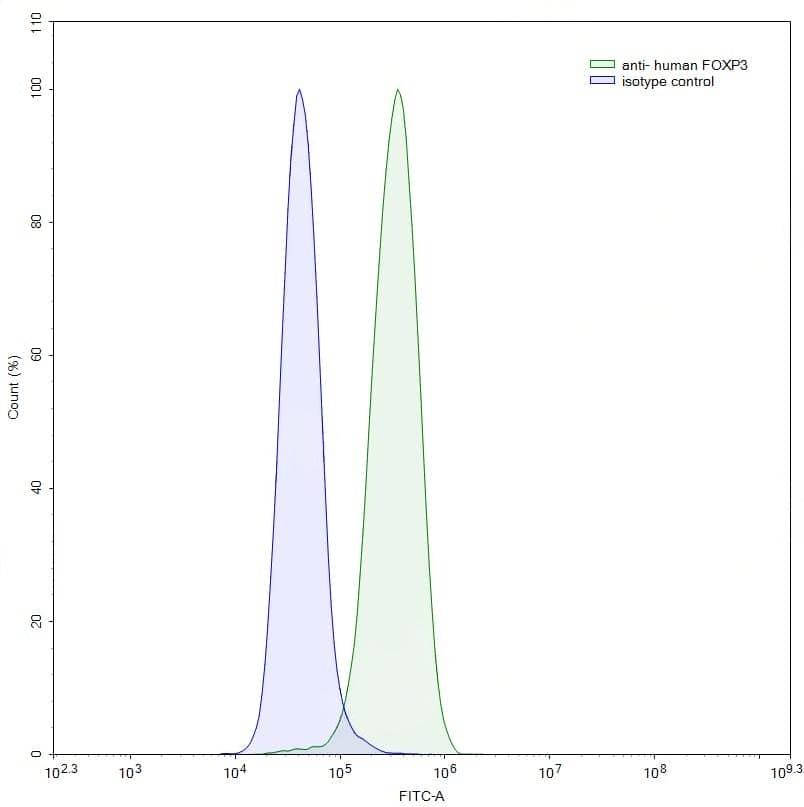 Flow-cytometry using anti-human FOXP3 antibody. Jurkat cells were stained with an irrelevant antibody (Blue Histogram) or an anti-human FOXP3 antibody monoclonal antibody (Catalog No.:TD-HV388045, Green Histogram) at a concentration of 5 µg/ml for 30 mins at RT. After washing, bound antibody was detected using a FITC conjugated goat anti-mouse antibody (TD-MF690414) and cells analysed on a NovoCyte Flow Cytometer.,Flow-cytometry using anti-human FOXP3 antibody. Hela cells were stained with an irrelevant antibody (Blue Histogram) or an anti-human FOXP3 antibody monoclonal antibody (Catalog No.:TD-HV388045, Green Histogram) at a concentration of 5 µg/ml for 30 mins at RT. After washing, bound antibody was detected using a FITC conjugated goat anti-mouse antibody (TD-MF690414) and cells analysed on a NovoCyte Flow Cytometer.