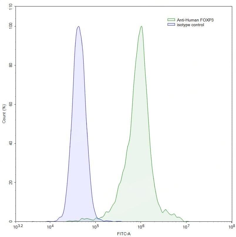 Flow-cytometry using anti-human FOXP3 antibody. Jurkat cells were stained with an irrelevant antibody (Blue Histogram) or an anti-human FOXP3 antibody monoclonal antibody (Catalog No.:TD-HV388035, Green Histogram) at a concentration of 5 µg/ml for 30 mins at RT. After washing, bound antibody was detected using a FITC conjugated goat anti-mouse antibody (TD-MF690414) and cells analysed on a NovoCyte Flow Cytometer.,Flow-cytometry using anti-human FOXP3 antibody. Hela cells were stained with an irrelevant antibody (Blue Histogram) or an anti-human FOXP3 antibody monoclonal antibody (Catalog No.:TD-HV388035, Green Histogram) at a concentration of 5 µg/ml for 30 mins at RT. After washing, bound antibody was detected using a FITC conjugated goat anti-mouse antibody (TD-MF690414) and cells analysed on a NovoCyte Flow Cytometer.