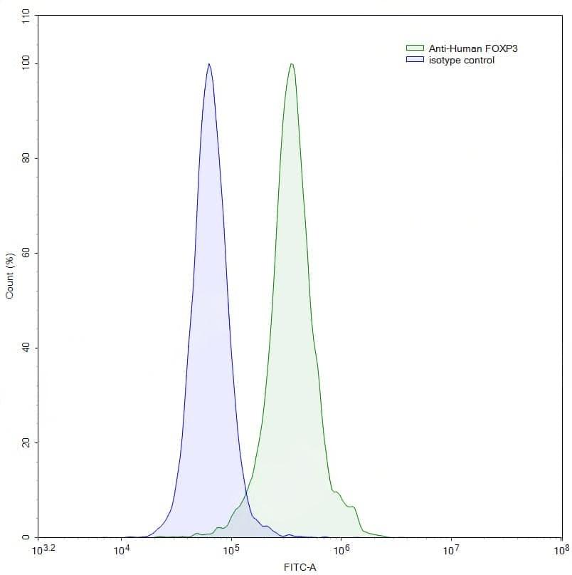 Flow-cytometry using anti-human FOXP3 antibody. Jurkat cells were stained with an irrelevant antibody (Blue Histogram) or an anti-human FOXP3 antibody monoclonal antibody (Catalog No.:TD-HV388015, Green Histogram) at a concentration of 5 µg/ml for 30 mins at RT. After washing, bound antibody was detected using a FITC conjugated goat anti-mouse antibody (TD-MF690414) and cells analysed on a NovoCyte Flow Cytometer.,Flow-cytometry using anti-human FOXP3 antibody. Hela cells were stained with an irrelevant antibody (Blue Histogram) or an anti-human FOXP3 antibody monoclonal antibody (Catalog No.:TD-HV388015, Green Histogram) at a concentration of 5 µg/ml for 30 mins at RT. After washing, bound antibody was detected using a FITC conjugated goat anti-mouse antibody (TD-MF690414) and cells analysed on a NovoCyte Flow Cytometer