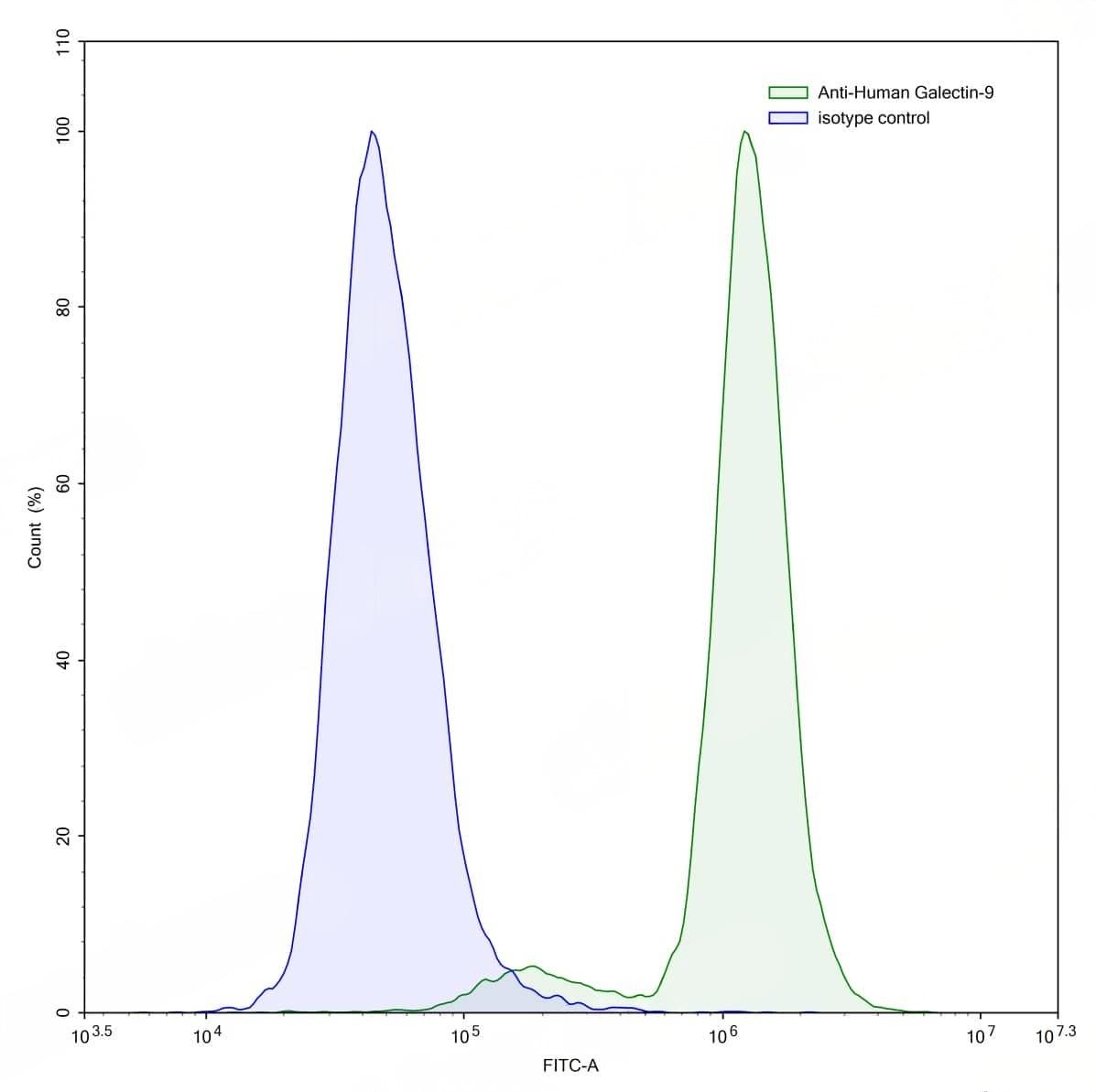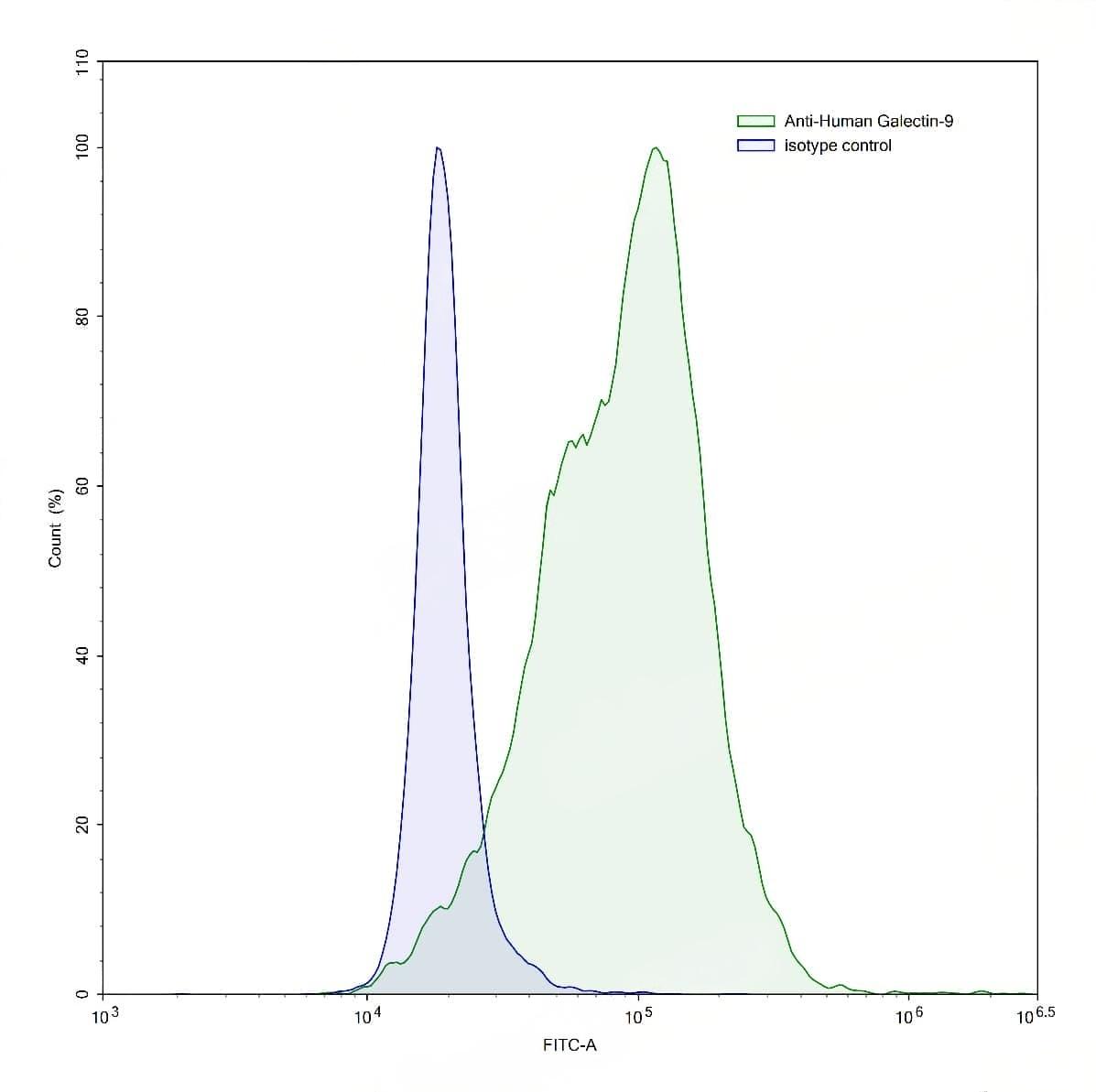Flow-cytometry using anti-human Galectin-9 antibody.Human Jurkat cell line were stained with an irrelevant antibody (Blue Histogram) or an anti-human Galectin-9 antibody monoclonal antibody (Catalog No.:TD-HT173013 ,Green Histogram) at a concentration of 5 µg/ml for 30 mins at RT. After washing, bound antibody was detected using a FITC conjugated goat anti-mouse antibody (Catalog No.:TD-MF690414) and cells analysed on a NovoCyte Flow Cytometer.,Flow-cytometry using anti-human Galectin-9 antibody.MOLT-4 cells were stained with an irrelevant antibody (Blue Histogram) or an anti-human Galectin-9 antibody monoclonal antibody (Catalog No.:TD-HT173013 ,Green Histogram) at a concentration of 5 µg/ml for 30 mins at RT. After washing, bound antibody was detected using a FITC conjugated goat anti-mouse antibody (Catalog No.:TD-MF690414) and cells analysed on a NovoCyte Flow Cytometer.,Flow-cytometry using anti-human Galectin-9 antibody.Human peripheral blood lymphocytes were stained with an irrelevant antibody (Blue Histogram) or an anti-human Galectin-9 antibody monoclonal antibody (Catalog No.:TD-HT173013 ,Green Histogram) at a concentration of 5 µg/ml for 30 mins at RT. After washing, bound antibody was detected using a FITC conjugated goat anti-mouse antibody (Catalog No.:TD-MF690414) and cells analysed on a NovoCyte Flow Cytometer. | SDS-PAGE for Anti-Human Gal-9/LGALS9 Antibody (G9.2-17). | Flow-cytometry using anti-human Galectin-9 antibody. THP-1 cells were fixed and permeabilized, then stained with an irrelevant antibody (Blue Histogram) or an anti-human Galectin-9 monoclonal antibody (Catalog No.:TD-HT173013, Yellow Histogram) at a concentration of 5 µg/ml for 30 mins at RT. After washing, bound antibody was detected using Goat Anti-Mouse IgG H&L Polyclonal Antibody, FITC (Catalog No.:TD-MF690414) and cells analysed on a NovoCyte Flow Cytometer.