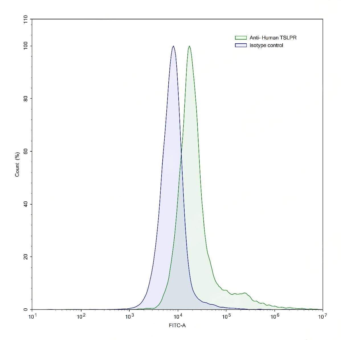 Flow-cytometry using anti-human TSLPR antibody.Human peripheral blood lymphocytes were stained with an irrelevant antibody (Blue Histogram) or an anti-human TSLPR antibody monoclonal antibody (Catalog No.:TD-HP521013 ,Green Histogram) at a concentration of 5 µg/ml for 30 mins at RT. After washing, bound antibody was detected using a FITC conjugated goat anti-mouse antibody (Catalog No.:TD-MF690414) and cells analysed on a NovoCyte Flow Cytometer. | SDS-PAGE for Anti-Human TSLPR/CRLF2 Antibody (13H5).