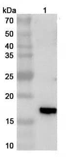 Western blot analysis was performed using anti-2-EP402R polyclonal antibody at 1ug/mL on various samples.Lane 1:recombinant ASFV EP402R (Catalog No:TD-VK599012)