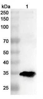 Western blot analysis was performed using anti-PEDV Nsp5/Mpro/3CL polyclonal antibody at 1ug/mL on recombinant PEDV Nsp5/Mpro/3CL (Catalog No.:TD-VK564082).,Western blot analysis was performed using anti-3CL-PEDV polyclonal antibody at 1ug/mL on various samples.Lane 1:recombinant PEDV Nsp5/Mpro/3CL (Catalog No:TD-VK564082)