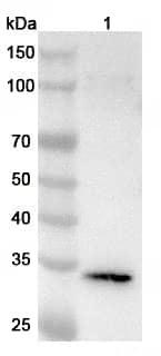 Western blot analysis was performed using anti-IGFBP1 polyclonal antibody at 1ug/mL on various samples.Lane 1:HepG2 cell lysate
