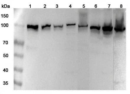 Western blot analysis was performed using anti-MTHFD1 polyclonal antibody at 1μg/ml on various samples.Lane 1:293T cell lysateLane 2:Jurkat cell lysateLane 3:K562 cell lysateLane 4:Hela cell lysateLane 5:A549 cell lysateLane 6:Mouse kidney lysateLane 7:Mouse liver lysateLane 8:Rat liver lysate