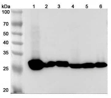 Western blot analysis was performed using anti-CA3 polyclonal antibody at 1µg/ml on various samples.Lane 1:Mouse liver lysateLane 2:Mouse lung lysateLane 3:Mouse kidney lysateLane 4:Rat liver lysateLane 5:Rat lung lysateLane 6:Rat kidney lysate