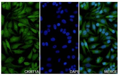 Hela cells were fixed with 4% paraformaldehyde for 20 minutes, followed by blocking with 5% goat serum for 1 hour. The cells were then incubated with a primary antibody targeting CKMT1A (TD-HY409014) at a concentration of 12.4 ug/ml overnight at 4°C. Afterward, the cells were incubated with a secondary antibody, Goat Anti-Rabbit IgG (Alexa Fluor-488) for 50 minutes at room temperature. The localization of CKMT1A was visualized (shown in green), and nuclear DNA was stained with DAPI (shown in blue).