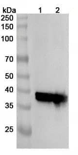 Western blot analysis was performed using anti-ARG1/Arginase-1 polyclonal antibody at 1ug/mL on recombinant ARG1/Arginase-1 (Catalog No.:TD-HY339022).,Western blot analysis was performed using anti-ARG1 polyclonal antibody at 1ug/mL on various samples.Lane 1:Mouse liver lysateLane 2:Rat liver lysate