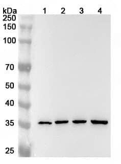 Western blot analysis was performed using anti-ANXA2 polyclonal antibody at 1ug/mL on various samples.Lane 1:NIH3T3 cell lysateLane 2:A431 cell lysateLane 3:A549 cell lysateLane 4:PC-12 cell lysate