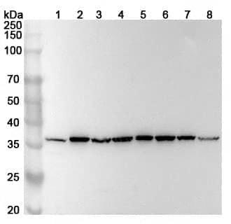 Western blot analysis was performed using anti-RPLP0 polyclonal antibody at 1ug/mL on various samples.Lane 1:NIH3T3 cell lysateLane 2:Hela cell lysateLane 3:293T cell lysateLane 4:A549 cell lysateLane 5:A431 cell lysateLane 6:A375 cell lsyateLane 7:H1299 cell lysateLane 8:PC-12 cell lysate