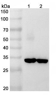 Western blot analysis was performed using anti-RLBP1 polyclonal antibody at 1ug/mL on recombinant RLBP1 (Catalog No.:TD-HY230012).,Western blot analysis was performed using anti-RLBP1 polyclonal antibody at 1ug/mL on various samples.Lane 1:Mouse eye lysateLane 2:Rat eye lysate