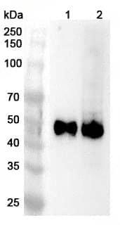 Western blot analysis was performed using anti-CD2 polyclonal antibody at 1ug/mL on various samples.Lane 1:Jurkat cell lysateLane 2:MOLT-4 cell lysate