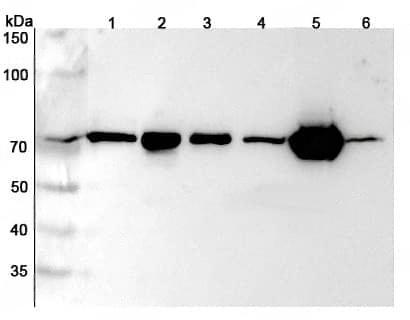 Western blot analysis was performed using anti-LMNB2 polyclonal antibody at 1μg/ml on various samples.Lane 1:HepG2 cell lysateLane 2:Raji cell lysateLane 3:Jurkat cell lysateLane 4:Hela cell lysateLane 5:293T cell lysateLane 6:MCF-7 cell lysate