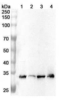 Western blot analysis was performed using anti-PSME3 polyclonal antibody at 1ug/mL on various samples.Lane 1:HepG2 cell lysateLane 2:Hela cell lysateLane 3:K562 cell lysateLane 4:293T cell lysate