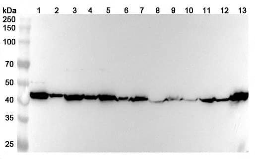 Western blot analysis was performed using anti-PSMC6 polyclonal antibody at 1ug/mL on various samples.Lane 1:293T cell lysateLane 2:SH-SY5Y cell lysateLane 3:NCI-H460 cell lysateLane 4:Hela cell lysateLane 5:HepG2 cell lysateLane 6:Mouse brain lysateLane 7:Mouse liver lysateLane 8:Mouse spleen lysateLane 9:Mouse kidney lysateLane 10:Rat brain lysateLane11:Rat liver lysateLane12:Rat spleen lysateLane13:Rat kidney lysate