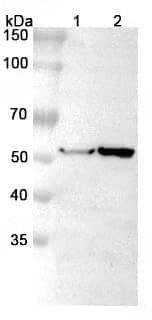 Western blot analysis was performed using anti-ABAT polyclonal antibody at 1μg/ml on various samples.Lane 1:Rat liver lysateLane 2:Rat kindney lysate
