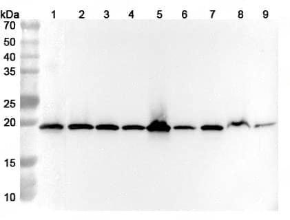 Western blot analysis was performed using anti-RPL24 polyclonal antibody at 1ug/mL on various samples.Lane 1:RAW264.7 cell lysateLane 2:Jurkat cell lysateLane 3:293T cell lysateLane 4:Hela cell lysateLane 5:HepG2 cell lysateLane 6:NIH3T3 cell lysateLane 7:HT-29 cell lysateLane 8:Mouse testis lysateLane 9:Rat testis lysate