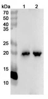 Western blot analysis was performed using anti-MYL7 polyclonal antibody at 1ug/mL on various samples.Lane 1:Mouse heart lysateLane 2:Rat heart lysate