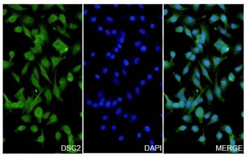 A549 cells were fixed with 4% paraformaldehyde for 20 minutes, followed by blocking with 5% goat serum for 1 hour. The cells were then incubated with a primary antibody targeting DSC2 (TD-HX236014) at a concentration of 93.35 ug/ml overnight at 4°C. Afterward, the cells were incubated with a secondary antibody, Goat Anti-Rabbit IgG (Alexa Fluor-488) for 50 minutes at room temperature. The localization of DSC2 was visualized (shown in green), and nuclear DNA was stained with DAPI (shown in blue).