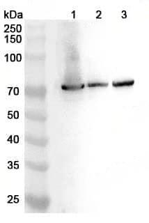 Western blot analysis was performed using anti-STXBP1 polyclonal antibody at 1ug/mL on various samples.Lane 1:Mouse brain lysateLane 2:Mouse cerebellum lysateLane 3:Rat cerebellum lysate