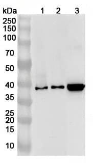 Western blot analysis was performed using anti-EIF4A1 polyclonal antibody at 1ug/mL on various samples.Lane 1:NIH3T3 cell lysateLane 2:PC12 cell lysateLane 3:A431 cell lysate