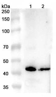 Western blot analysis was performed using anti-ROM1 polyclonal antibody at 1μg/ml on various samples.Lane 1:Mouse eye lysateLane 2:Rat eye lysate
