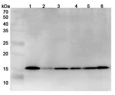 Western blot analysis was performed using anti-MAGOH polyclonal antibody at 1ug/mL on various samples.Lane 1:Hela cell lysateLane 2:HL60 cell lysateLane 3:K562 cell lysateLane 4:Raji cell lysateLane 5:Jurkat cell lysateLane 6:Lncap cell lysate