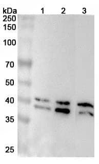 Western blot analysis was performed using anti-SET polyclonal antibody at 1µg/ml on various samples.Lane 1:Hela cell lysateLane 2:HepG2 cell lysateLane 3:NIH3T3 cell lysate