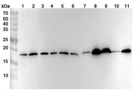 Western blot analysis was performed using anti-RPL11 polyclonal antibody at 1ug/mL on various samples.Lane 1:BXPC-3 cell lysateLane 2:A549 cell lysateLane 3:HepG2 cell lysateLane 5:NIH3T3 cell lysateLane 7:Mouse lung lysateLane 8:Mouse pancreas lysateLane 9:Rat liver lysateLane 10:Rat lung lysateLane11:Rat pancreas lysate