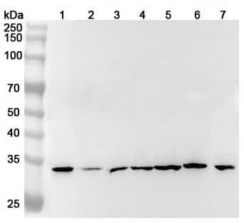 Western blot analysis was performed using anti-MNAT1 polyclonal antibody at 1ug/mL on various samples.Lane 1:A375 cell lysateLane 2:MCF-7 cell lysateLane 3:293T cell lysateLane 4:HepG2 cell lysateLane 5:K562 cell lysateLane 6:Mouse testis lysateLane 7:Rat testis lysate