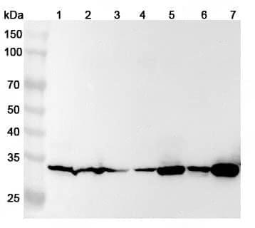 Western blot analysis was performed using anti-TPM4 polyclonal antibody at 1ug/mL on various samples.Lane 1:A431 cell lysateLane 2:HepG2 cell lysateLane 3:HepG2 cell lysateLane 4:HT-29 cell lysateLane 5:C2C12 cell lysateLane 6:Jurkat cell lysateLane 7:U87 cell lysate